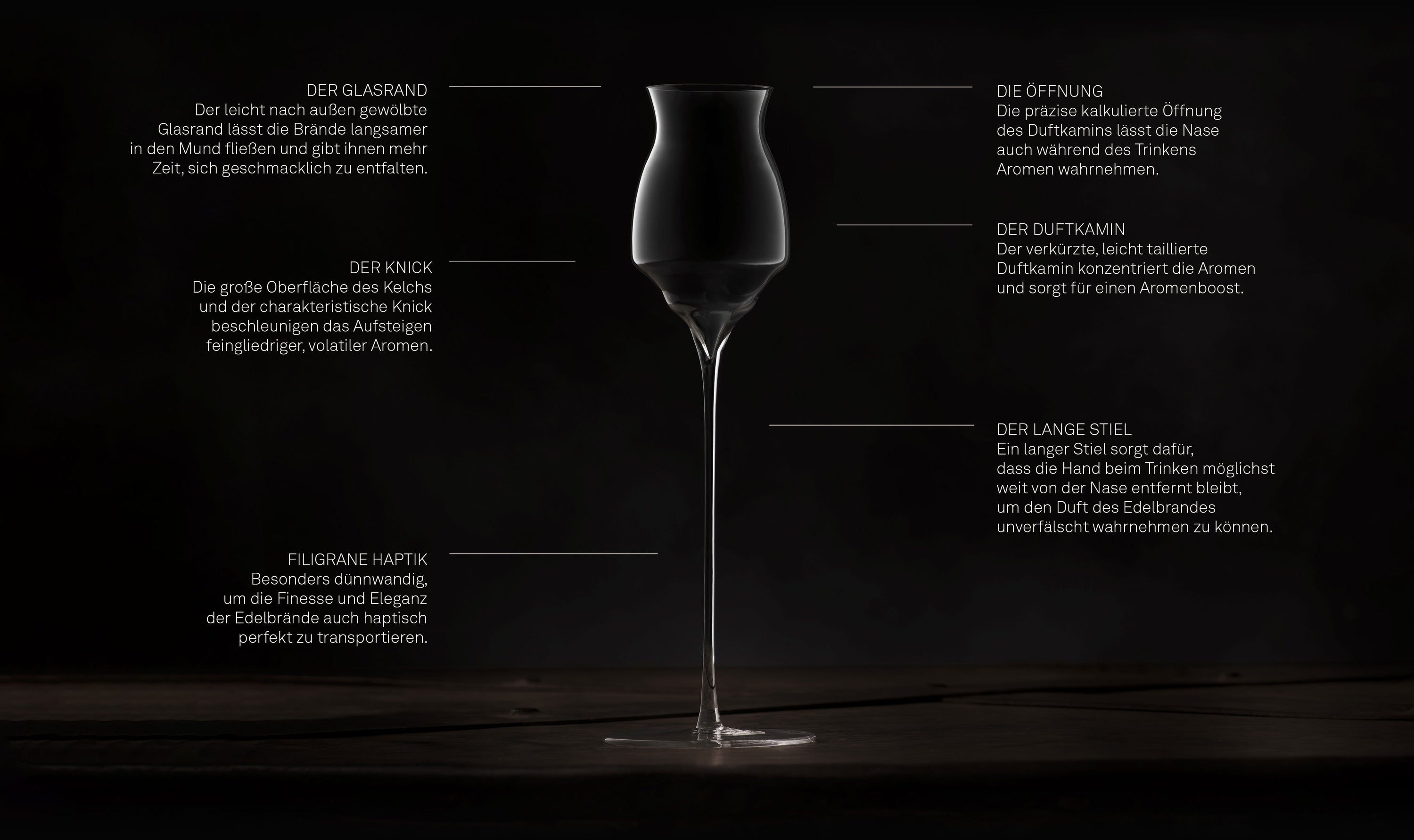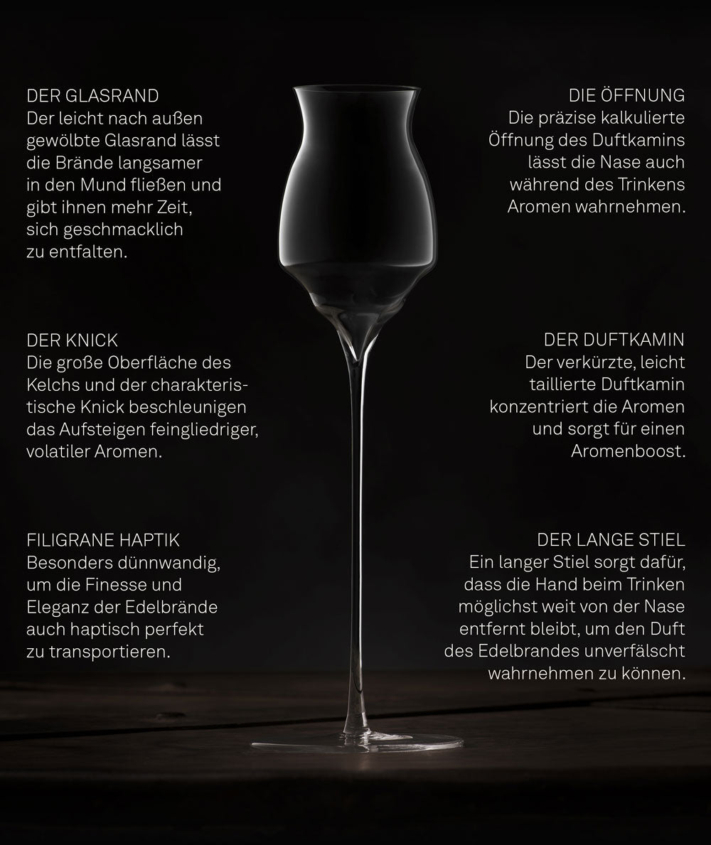 Unser Anspruch war es, ein Glas zu entwerfen, das diesen besonderen Destillaten die perfekte Bühne bietet. Ein Glas, dem es gelingt die feingliedrigen, fast fragil anmutenden Aromen dieser handwerklich destillierten Brände authentisch, intensiv und pur einzufangen und erlebbar zu machen.