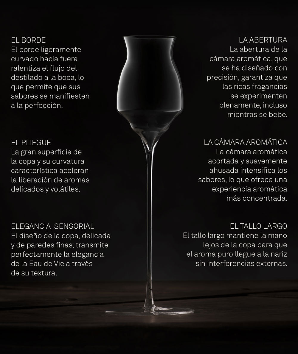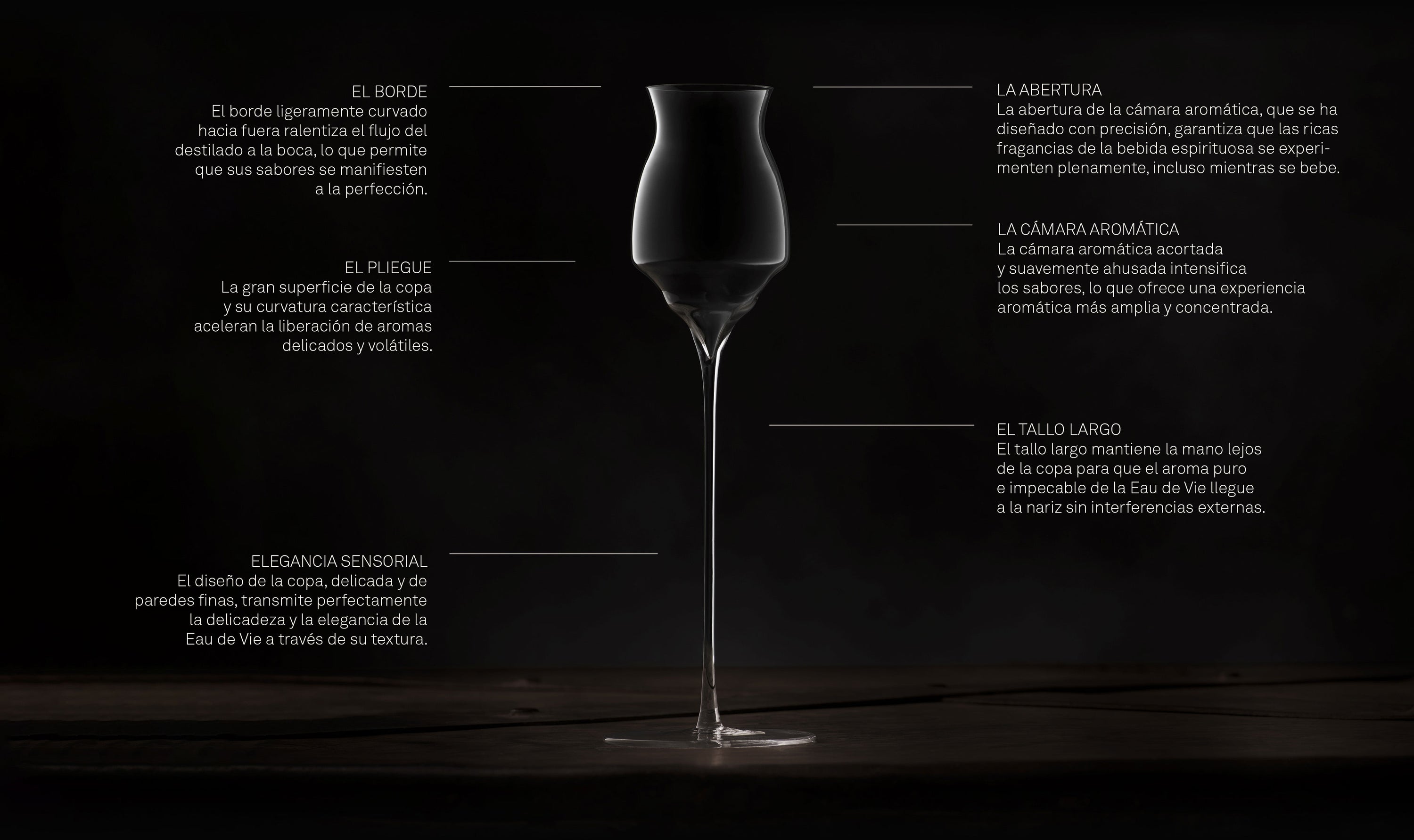 Esta copa, elaborada mediante un meticuloso proceso de diseño que incluye distintos prototipos, un análisis sensorial detallado y una colaboración con expertos en destilación, es un testimonio del arte y de la herencia que hay detrás de cada Eau de Vie de calidad superior. Su elegante forma capta y eleva la complejidad de estas bebidas espirituosas artesanales y da vida a la visión de los destiladores en cada sorbo.